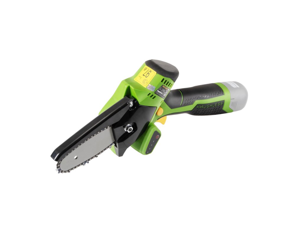 Kompaktní 16V jednoruční řetězová pila navržená pro práci v omezeném prostoru a přesné řezy při prořezávání stromů a keřů.
