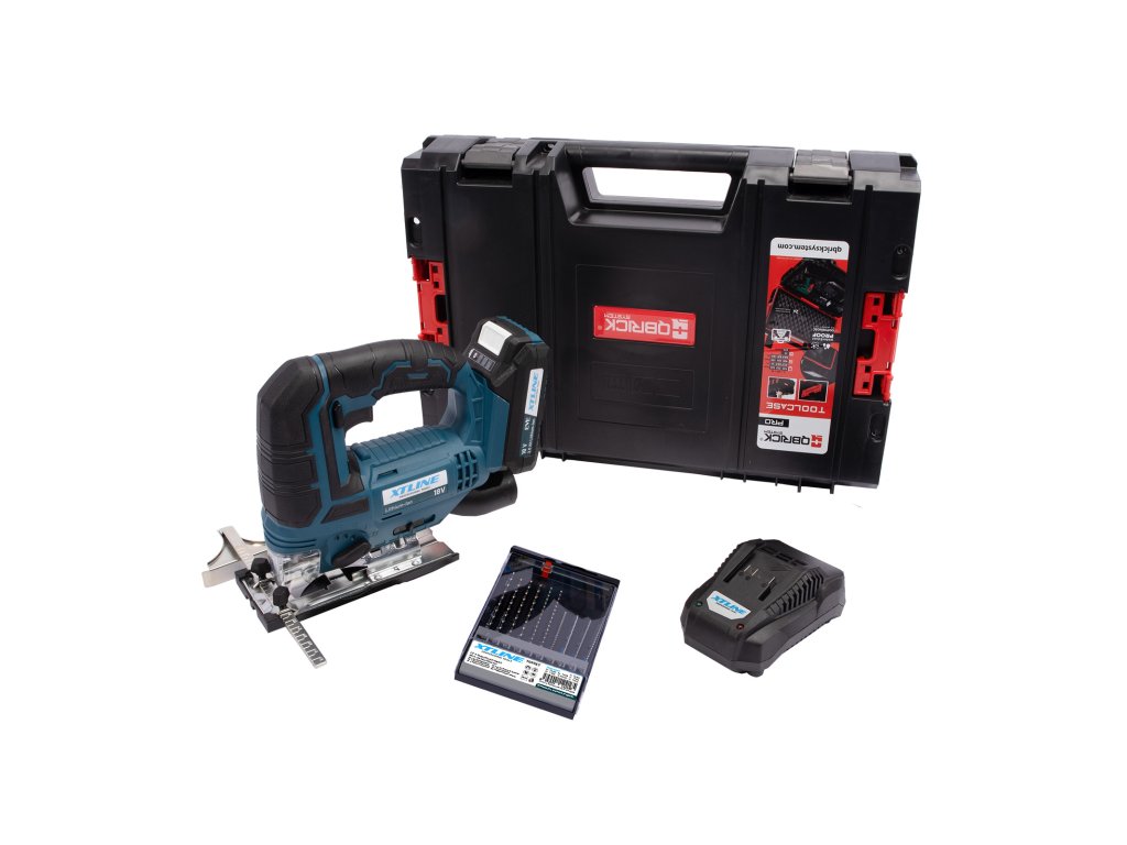 Aku přimočará pila 18 V + baterie 2.0 Ah + nabíječka 3.5 A + pilové plátky + box