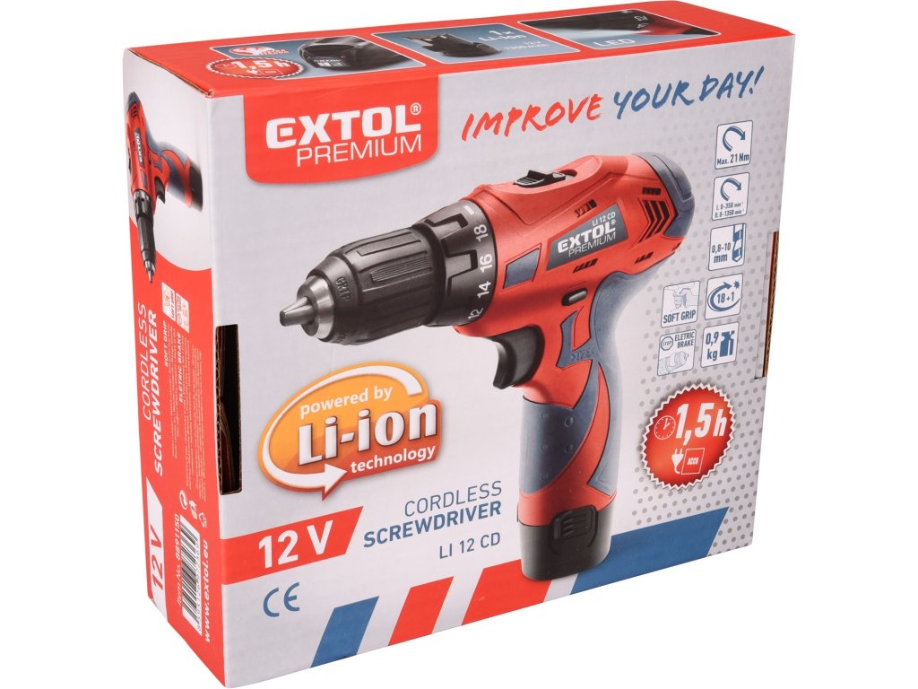 EXTOL PREMIUM vrtací šroubovák aku, 12V Li-ion, 1500mAh