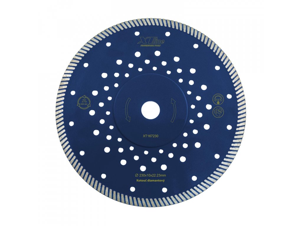 Diamantový turbo segmentový kotouč pro suché i mokré řezání betonu, armovaného betonu, zdiva, kamene, cihel, dlaždic, obkladů,mramor,břidlice,střešní tašky....Konstrukce kotouče dovoluje velmi rychlé řezání s dlouhou životnsotí segmentů. Laserem vařený Turbo segment zaručuje menší zahřívání segmentů. chladící otvory.Doplňkové parametry
