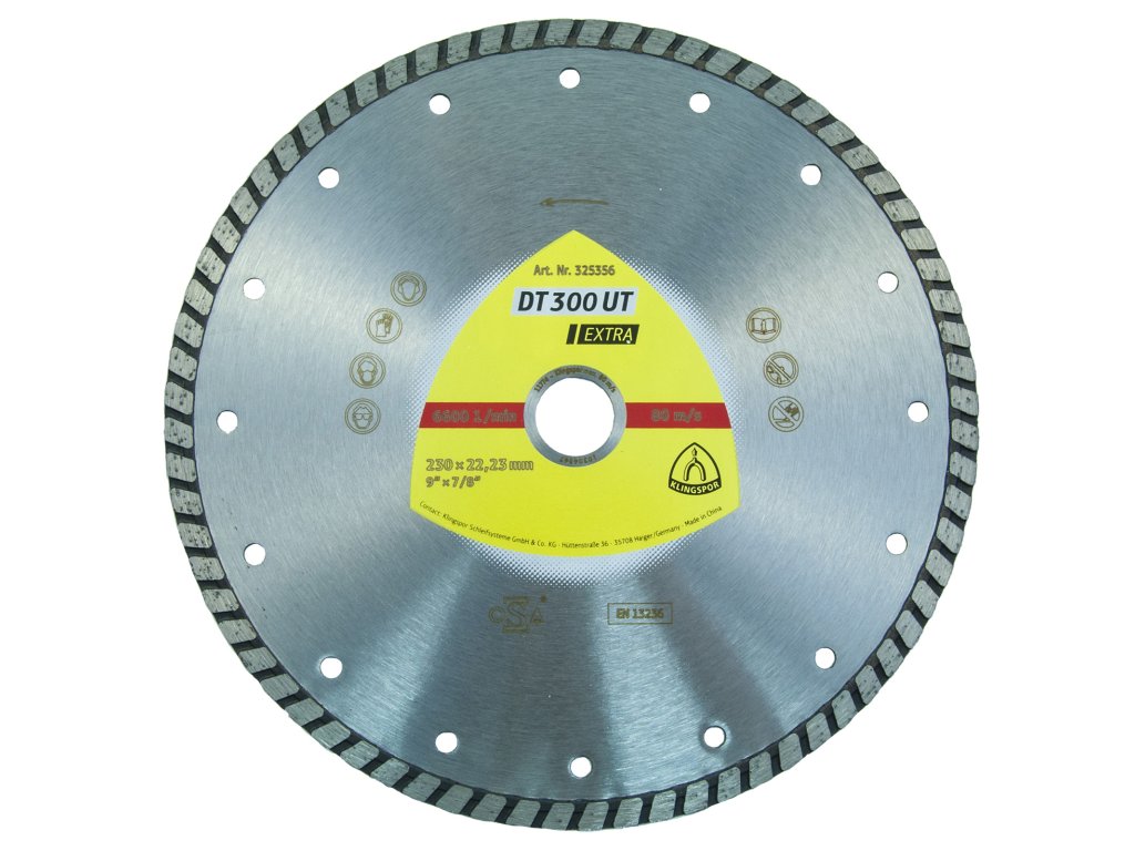 Standartní kotouč s vysokým řezným výkonem pro mnohostranné opracování nejrůznějších stavebních materiálů. Provedení: slinutý Okraj: uzavřený turbo řezný okraj Stroje: úhlová bruska Max .pracovní rychlost. 80 m/s Přípustné otáčky: 6600/min. Šířka x Výška segmentu: 2,5 x 7 mm Průměr x Otvor: 230 x 22,23 mmDoplňkové parametry