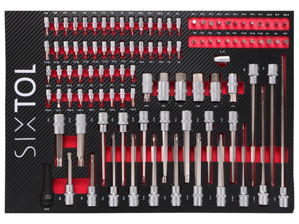 Díky dvěma velkým modulům získáte širokou sadu hlavic ve třech čtyřhranových velikostech, ráčen, prodloužení a kloubů, ale také komplexní sadu bitů, speciálních nástavců, bezpečnostních bitů, torxů, imbusů, zástrčných klíčů i speciálních hlavic XZN a Cr-Mo.