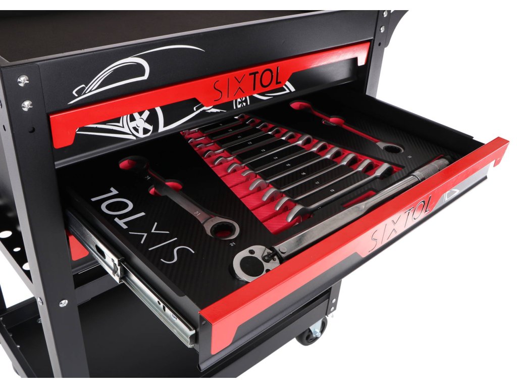Vozík nabízí tři plně výsuvné zásuvky na kuličkových pojezdech, každou s nosností 25 kg, a navíc spodní odkládací polici pro větší nářadí nebo elektrocentrály. Horní plocha je vybavena ochranným lemem, takže se vám nářadí nesesune při práci.