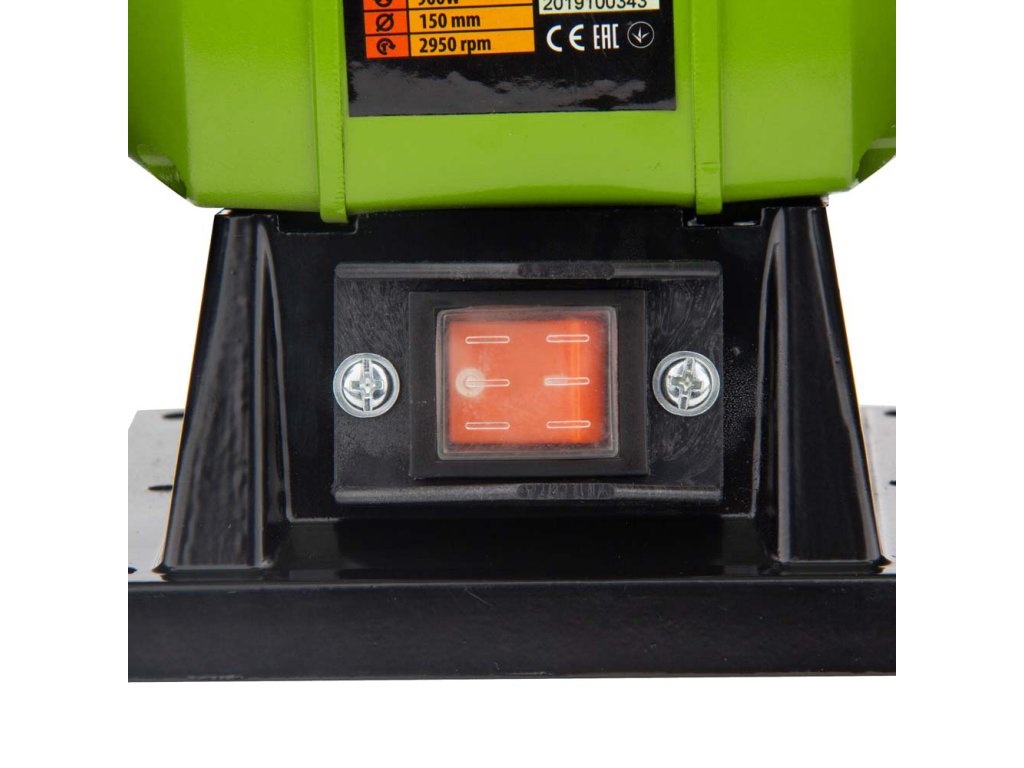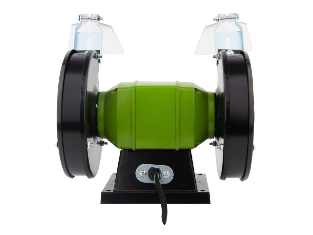 Bruska je dodávána se dvěma brusnými kotouči o průměru 150 mm a zrnitostech P80 a P36, což umožňuje jak jemné dokončovací práce, tak i základní hrubé broušení. Gumové nožky minimalizují vibrace a zajišťují stabilitu při práci. Součástí jsou opěrné plochy pro vedení obrobku a ochranné sklo, které chrání oči před odlétajícími částicemi.