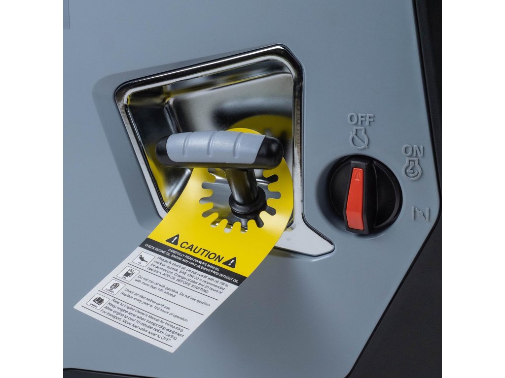Ruční startování pomocí táhla je jednoduché a spolehlivé. Nádrž o objemu 4 litry vystačí až na 7 hodin provozu, zatímco automatická regulace zátěže šetří palivo a snižuje hlučnost – ideální pro tichý provoz i v noci.