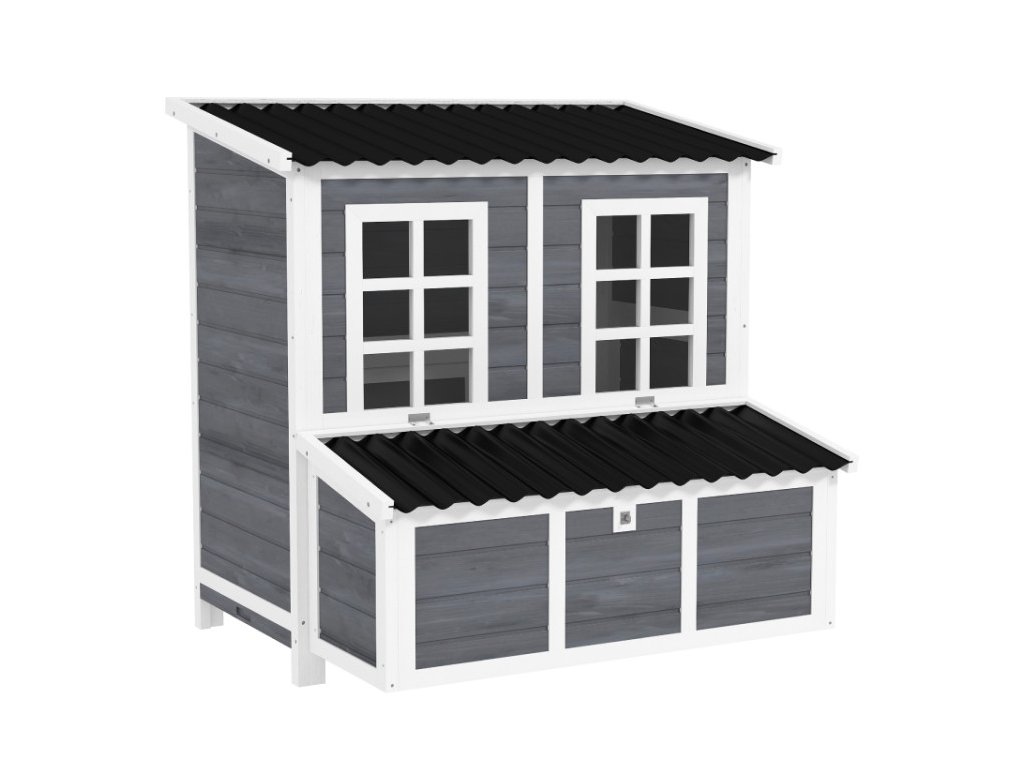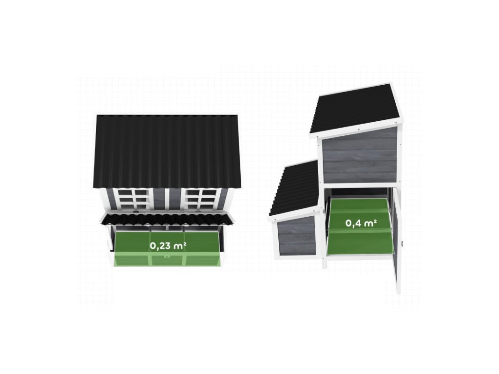 Díky dvěma vstupním dveřím a rampě mohou slepice volně a bezpečně přecházet mezi kurníkem a venkovním prostorem. Vnitřní hřady poskytují komfortní místo pro odpočinek a spánek, zatímco okna zajišťují dostatek světla a umožňují kontrolu hejna bez zbytečného rušení. Kurník je vyroben z kvalitního masivního jedlového dřeva a ošetřen voděodolným nátěrem, který prodlužuje jeho životnost. Vyvýšené provedení chrání konstrukci před vlhkostí od země a zlepšuje cirkulaci vzduchu. Plastová střecha pak poskytuje spolehlivou ochranu proti dešti a nepříznivému počasí.