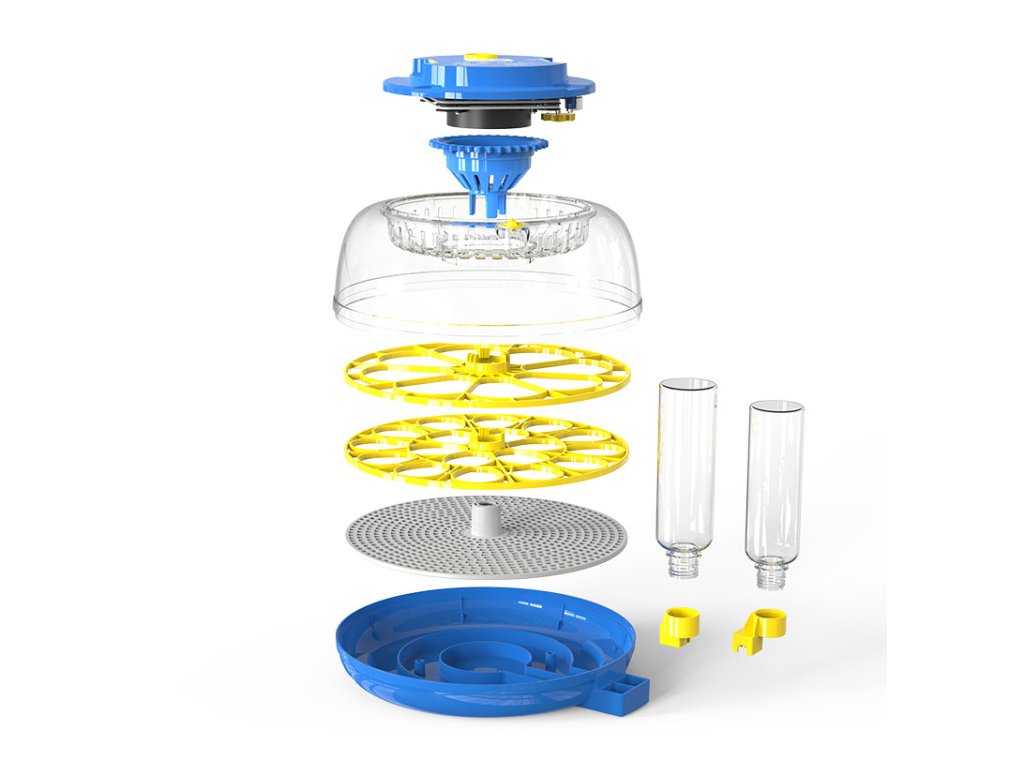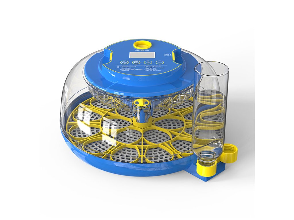 Regulace vlhkosti probíhá jednoduše – v prvních dnech líhnutí se používá jedna lahev s vodou pro naplnění jednoho kanálku, v závěrečné fázi se přidává druhá lahev, čímž dojde k současnému naplnění obou vodních kanálků a vlhkost zvýší na hladinu optimální k vylíhnutí vajec. Díky přehlednému displeji, který zobrazuje hodnotu teploty i vlhkosti, máte celý proces líhnutí pod kontrolou.