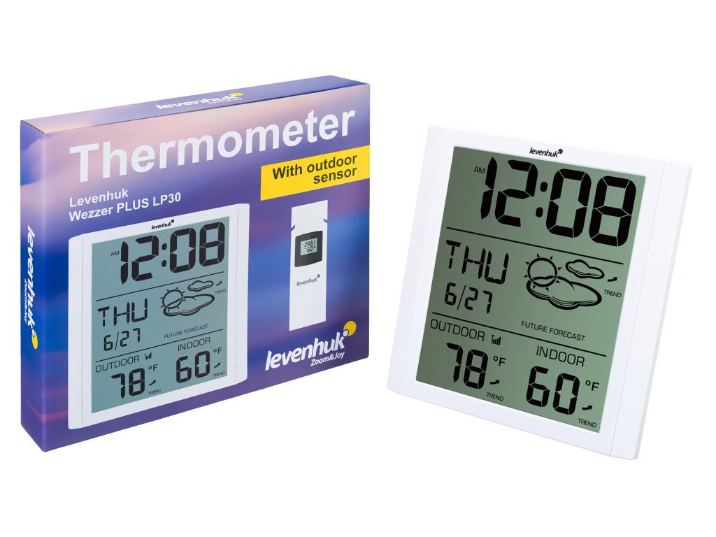Teploměr Levenhuk Wezzer PLUS LP30 – skvělý přístroj pro sledování počasí venku a kontrolu mikroklimatu v místnosti. Zaznamenává přesné vnitřní a venkovní teploty, měří vlhkost venkovního vzduchu, předpovídá počasí a vyhodnocuje trendy v meteorologických změnách. Maximální a minimální hodnoty se zaznamenávají do paměti přístroje. Kromě funkcí pro kontrolu klimatu je k dispozici kalendář a hodiny, které jsou velmi užitečné: zařízení může fungovat jako několik přístrojů najednou.