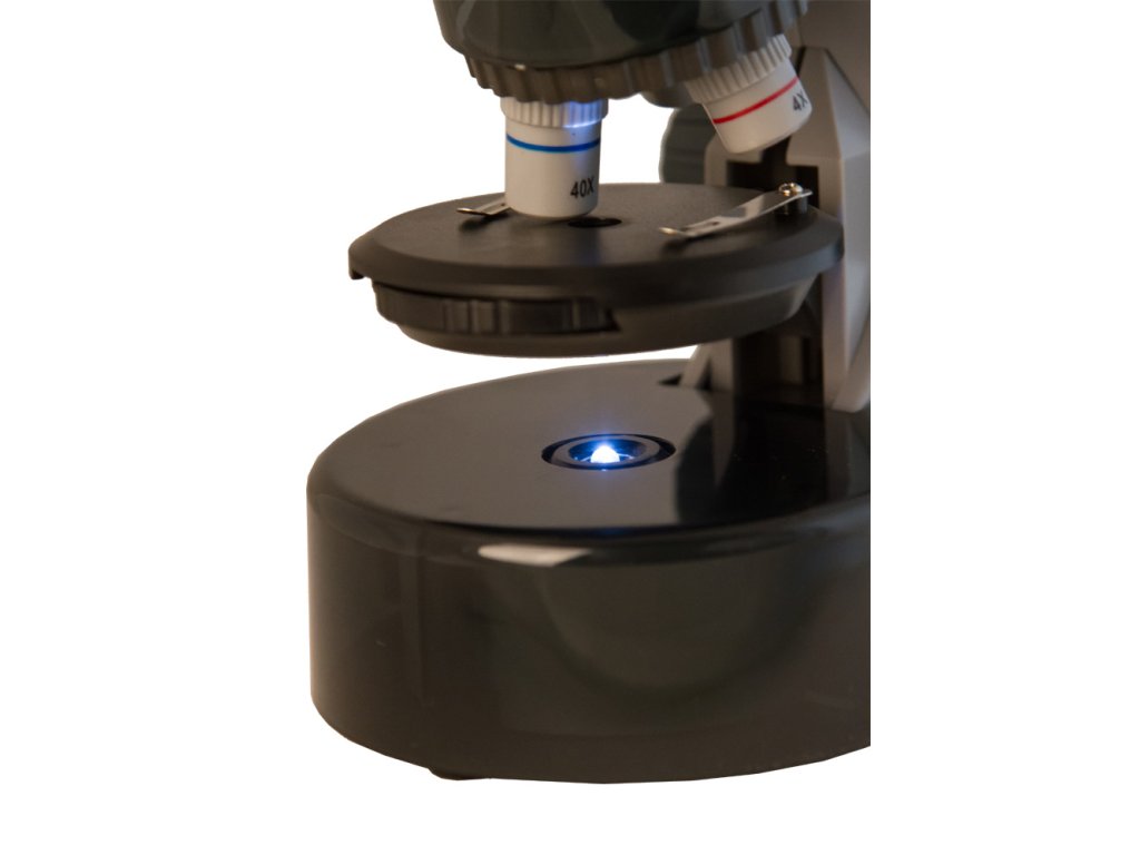 mikroskopu sklon 45°. Mikroskop se napájí z baterií – díky tomu je jeho