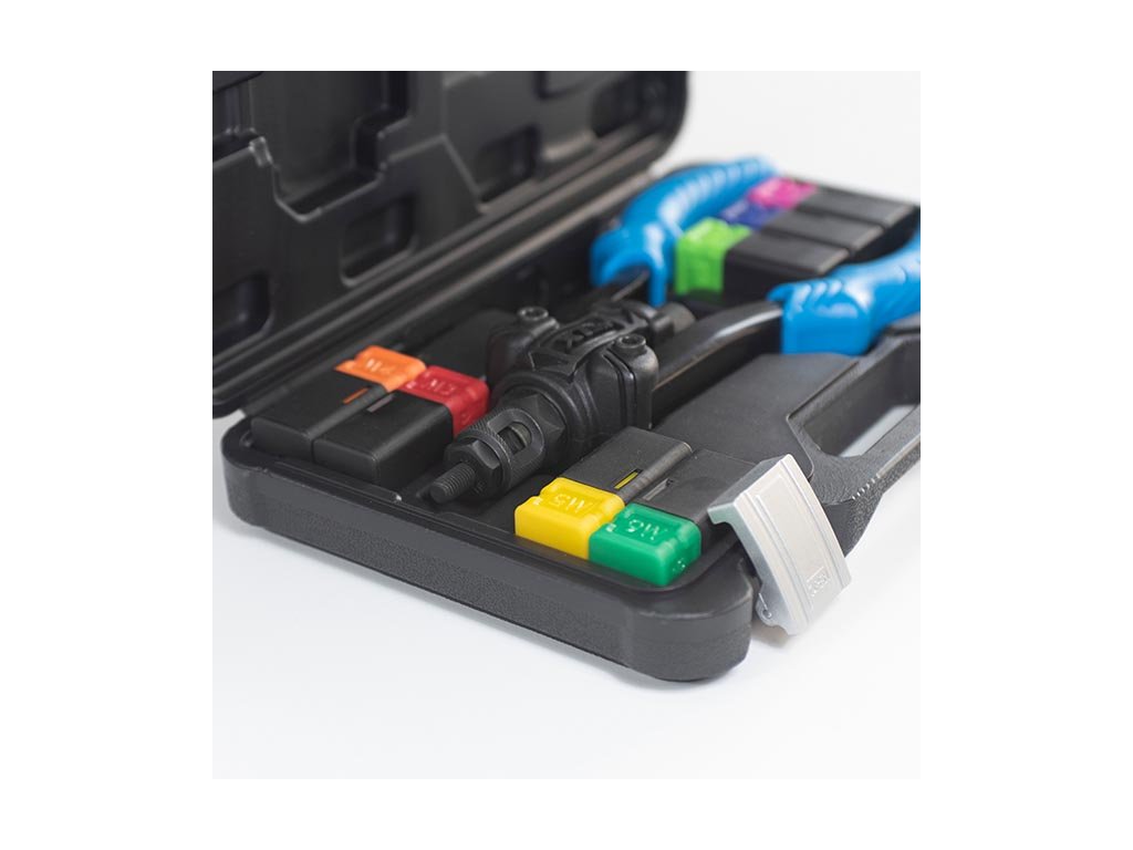 Tělo kleští je vyrobeno z odolné hliníkové slitiny, která je zároveň lehká, což usnadňuje manipulaci. Tvrzené Cr-Mo čelisti zaručují vysokou odolnost a dlouhou životnost nástroje. Kleště jsou vybaveny koncovkami pro maticové nýty v různých velikostech, a to M3, M4, M5, M6, M8, M10, M12. Klíč pro výměnu koncovek je součástí balení, stejně jako praktický plastový box pro bezpečné uložení kleští a nýtovacích nástavců.