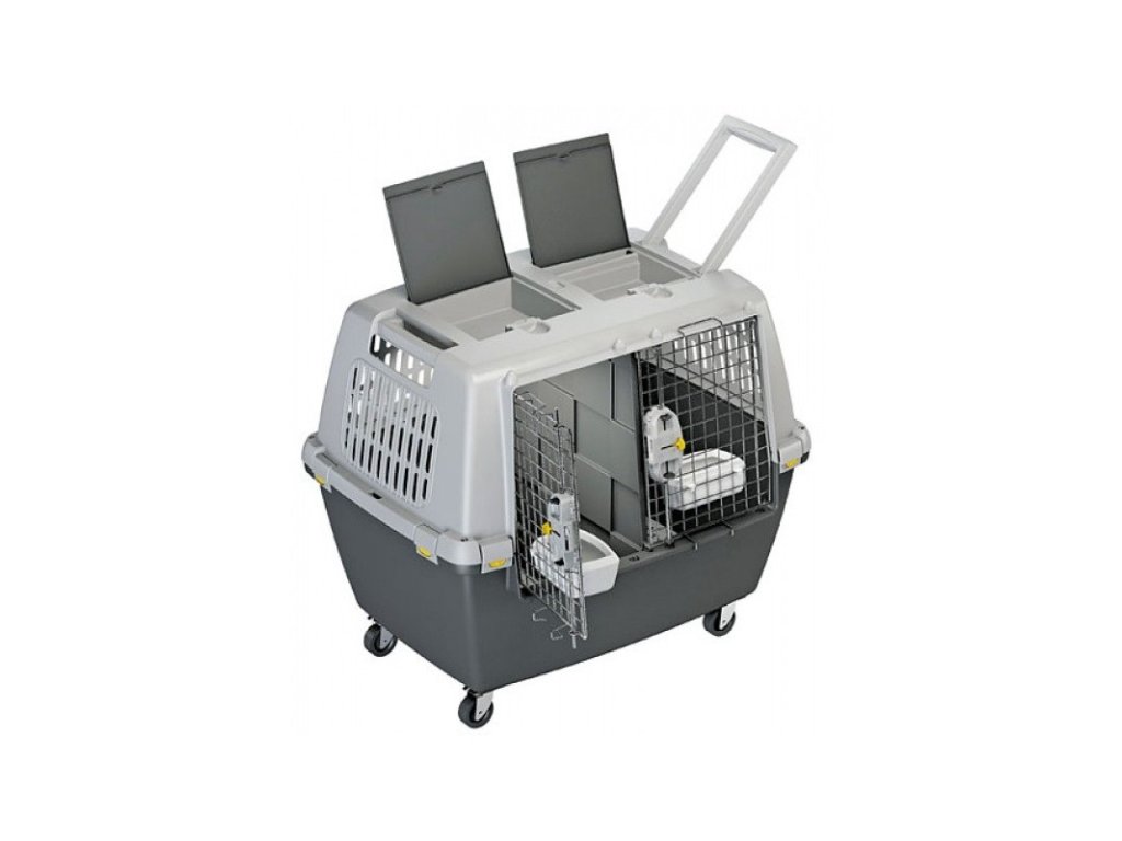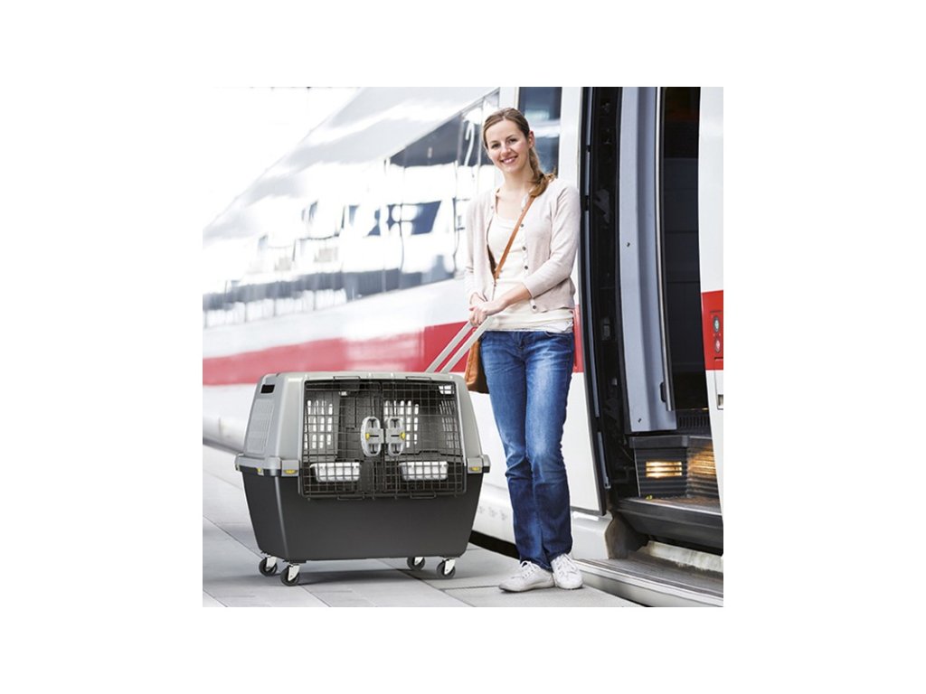 Originální velká přepravka na psa s kolečky, madlem a miskou a uzamikatelnými dvířky- GULLIVER TOURING. Tento transportní box - přenoska na psa je schválená mezinárodní leteckou asociací IATA pro transport do letadla.