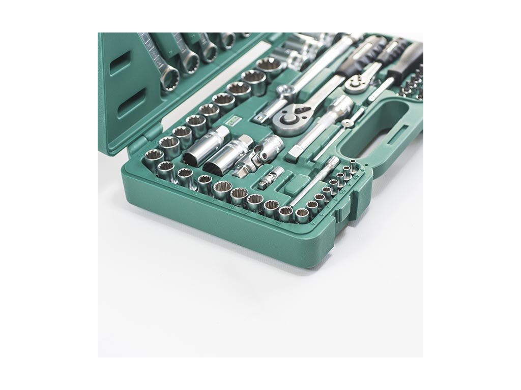 Kromě 1/4” a 1/2” ráčen sada zahrnuje také 1/4“ nástavec s rukojetí a různé prodloužení, například 50mm a 150mm pro 1/4” i 125mm a 150mm pro 1/2”. Pro práci se svíčkami je přiložena hlavice na svíčky 15 mm a 21 mm, a pro specifické aplikace je součástí sady jezdec na vratidlo kardan pro 1/4” a 1/2” ráčny.