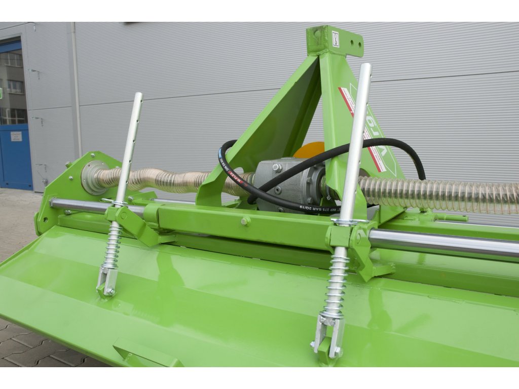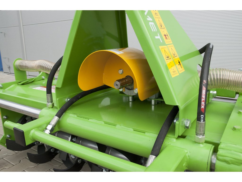 Pracovní hloubka (12 cm) se nastavuje pomocí bočních ližin. Velmi důležitým parametrem stroje je rychlost otáčení hřídele nože, která je 265 ot./minHydraulický boční posuv o 56 cm se vyhne překážkám a zabrání tomu, aby traktor poškodil rostliny při provozu stroje, například v sadech.