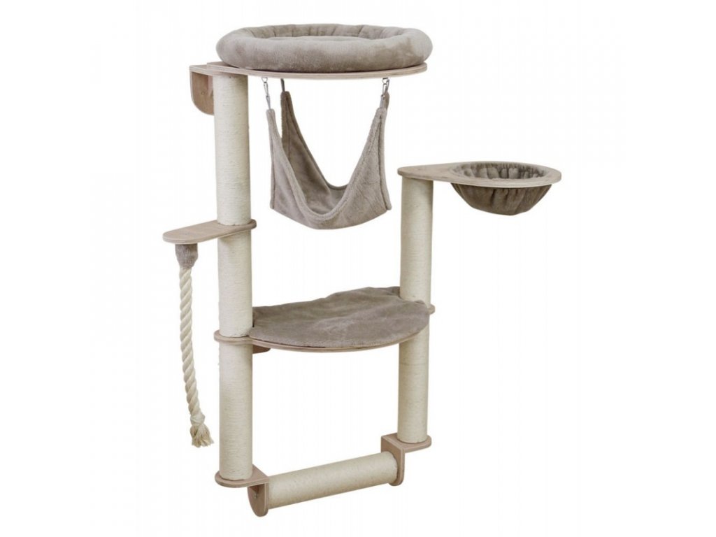 - Rozměry – celková výška 138 cm, pelíšek v horním patře 48 x 40 cm, hamaka 40 x 30 cm, kulaté patro s průměrem 50 cm.