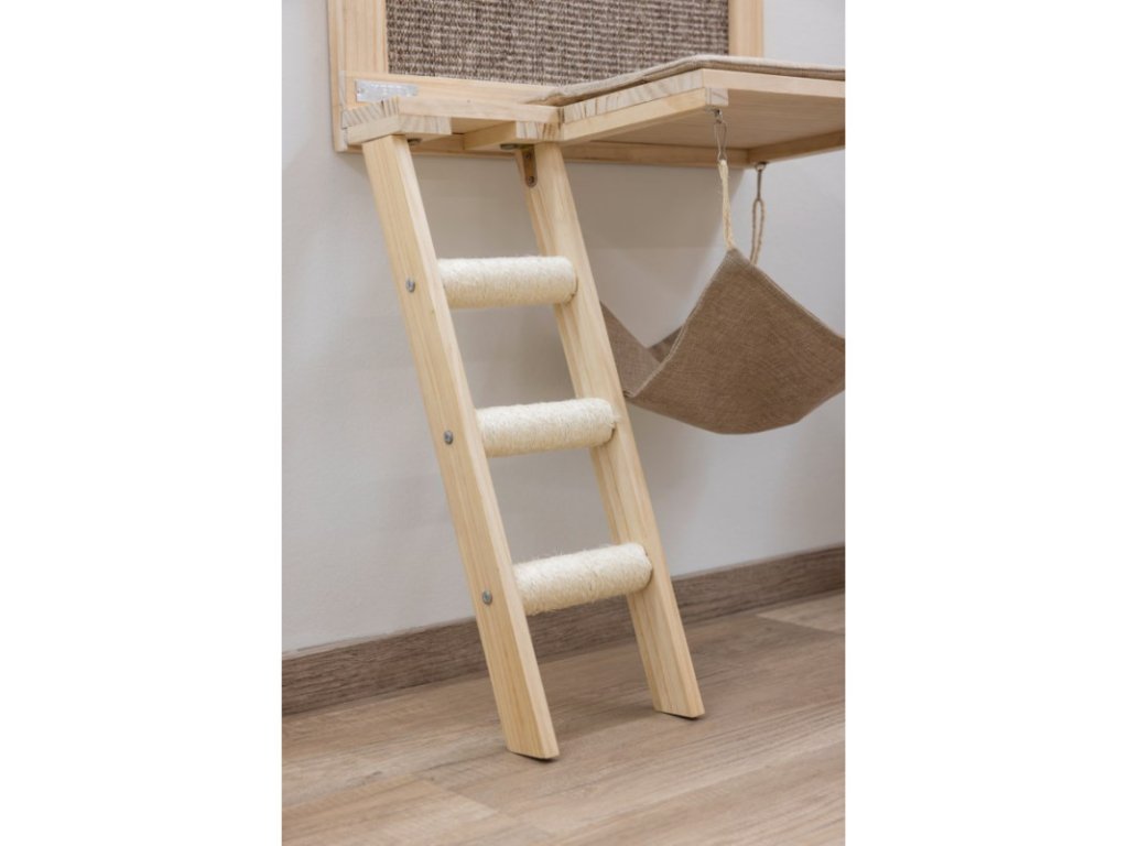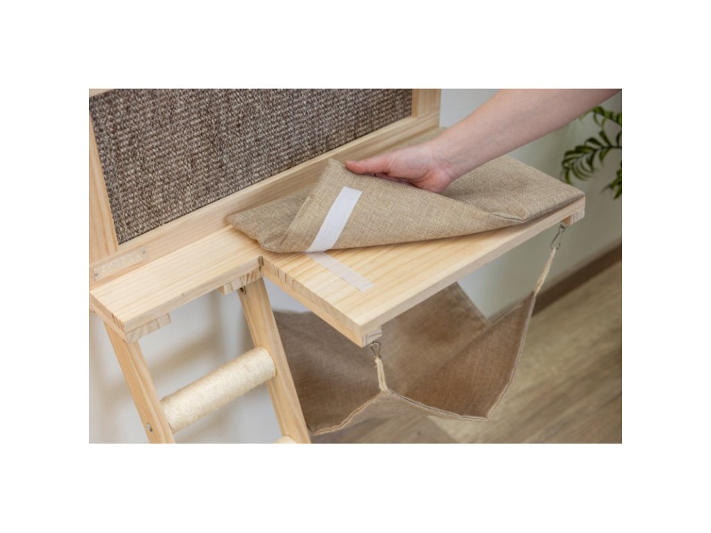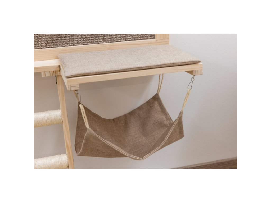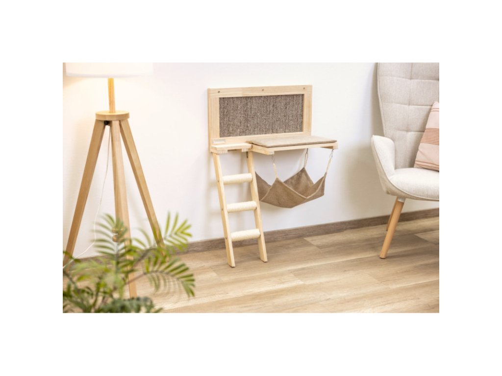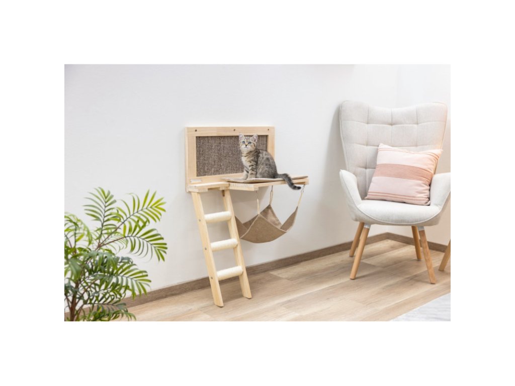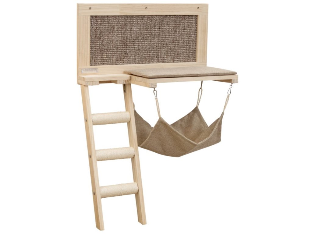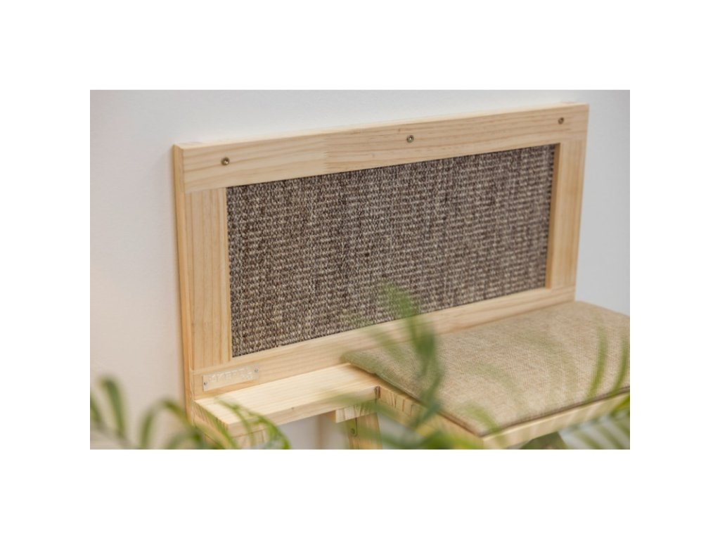 Elegantní, praktické a víceúčelové odpočívadlo pro kočky na stěnu obsahuje odpočívací plochu s polštářem, škrabadlo ze sisalu a závěsnou houpací síť. Kočičí škrabadlo je vyrobeno z robustního dřeva, sisalu a polyesteru a zaručuje tak odolnost a stabilitu. Integrované škrabadlo ze sisalu pomáhá udržet drápky zdravé a zároveň ušetří nábytek od škrábancu. Kolem schudků je omotán sisal pro pohodlný a bezpečný přístup na pozorovatelnu.