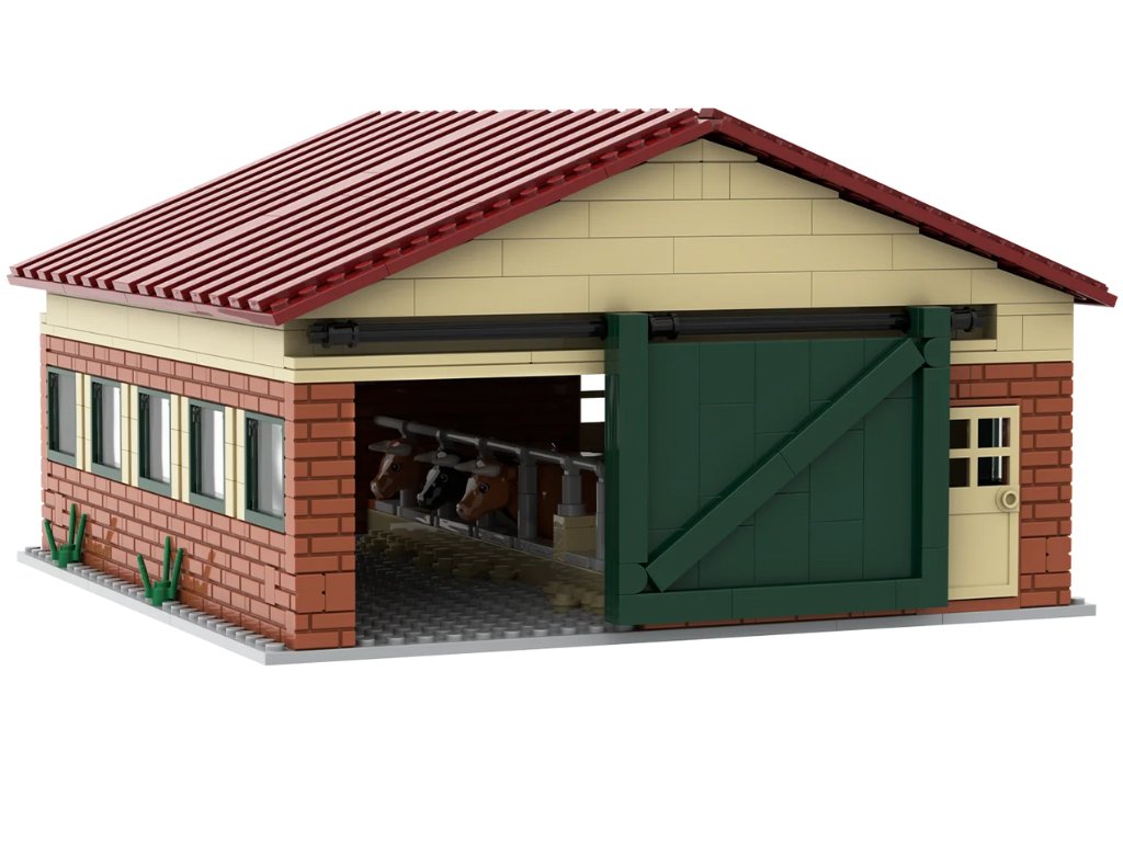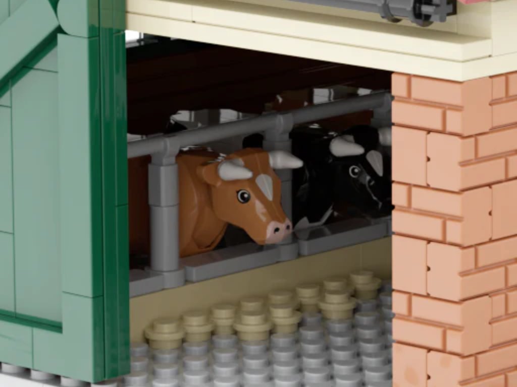 Stavebnice není jen obyčejná krabice kostek. Funkční vrata, propracovaná střecha, žlaby a boxy pro zvířata dělají z modelu věrnou miniaturu tradičního kravína, kterou si užiješ při stavění i při hře.