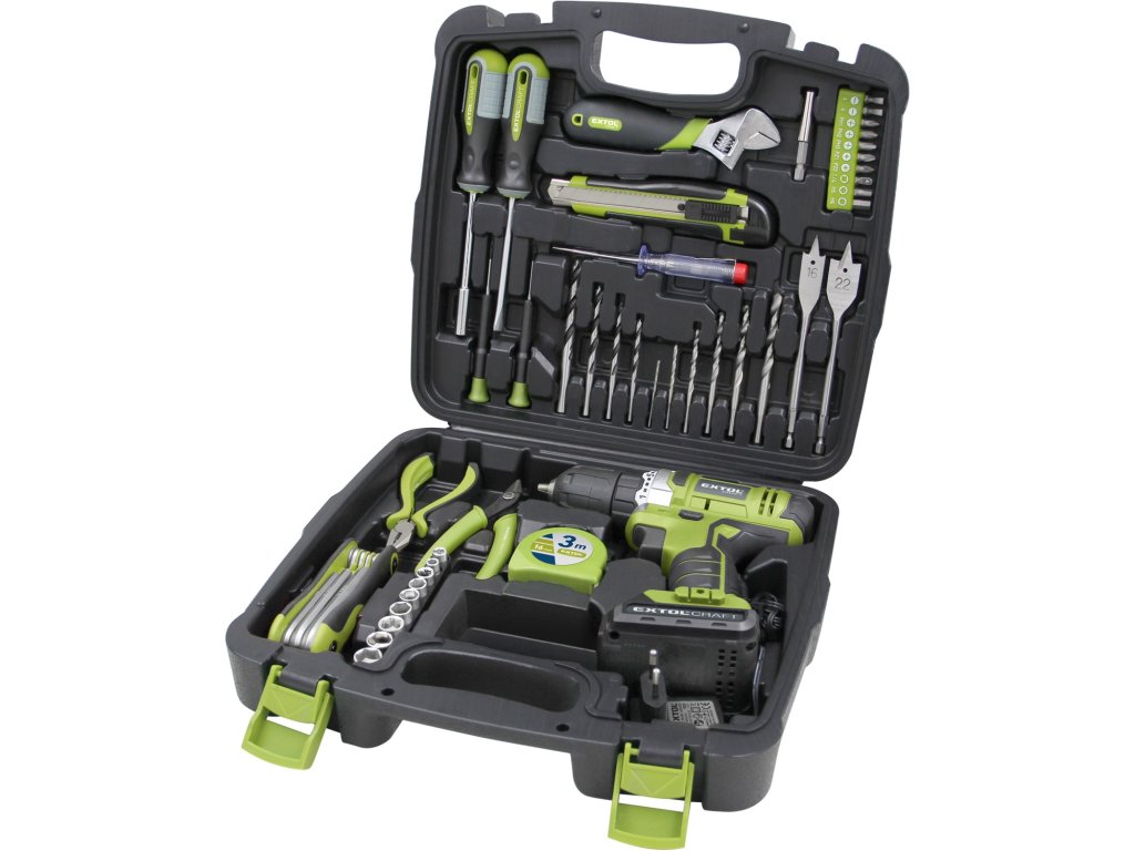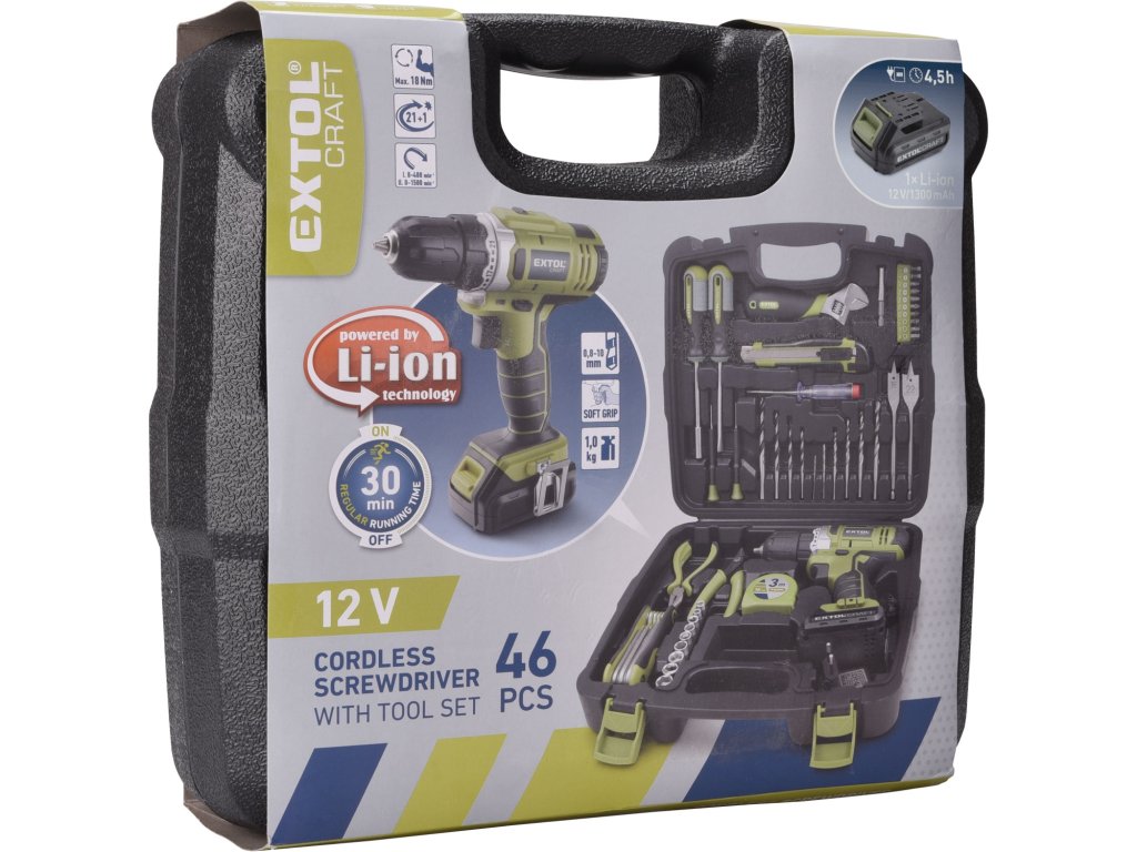 Vrtací šroubovák aku 12V Li-ion s nářadím, sada 46ks, EXTOL CRAFT 422800