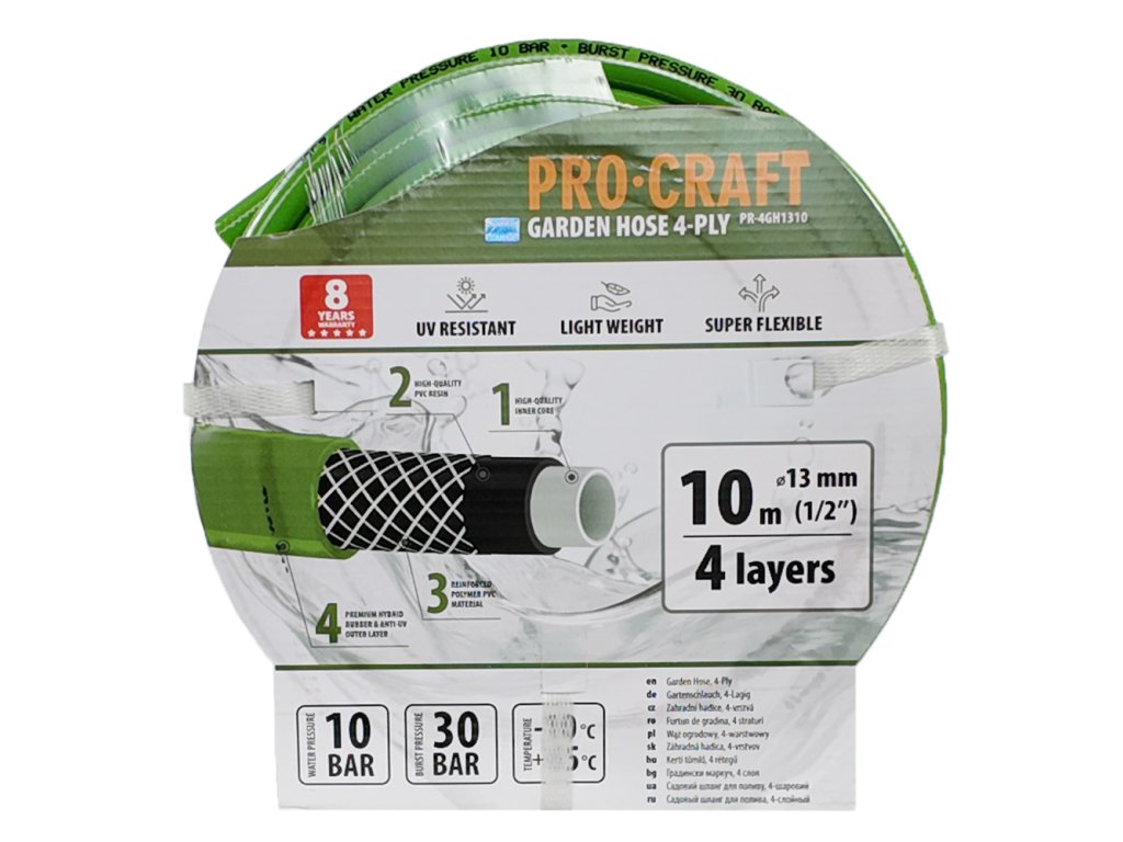 Zahradní hadice Procraft PR-4GH1310 je zkrátka spolehlivým a odolným pomocníkem pro každého zahrádkáře, který ocení dlouhou životnost a bezstarostné používání.