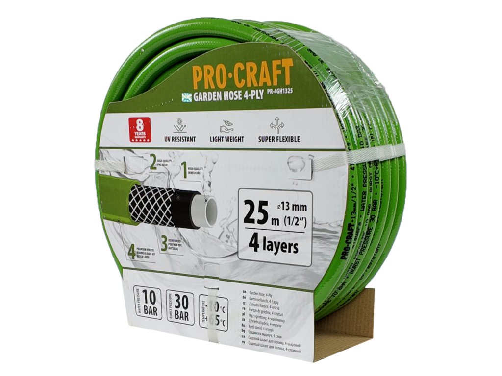 Zahradní hadice Procraft PR-4GH1325 je zkrátka spolehlivým a odolným pomocníkem pro každého zahrádkáře, který ocení dlouhou životnost a bezstarostné používání