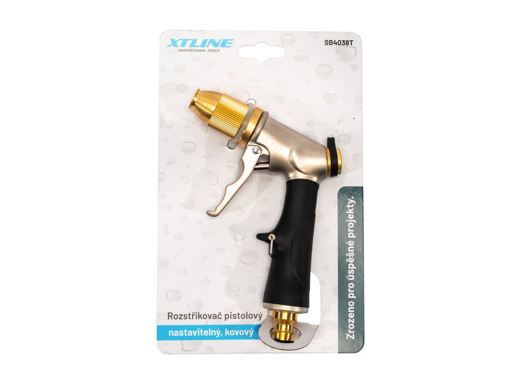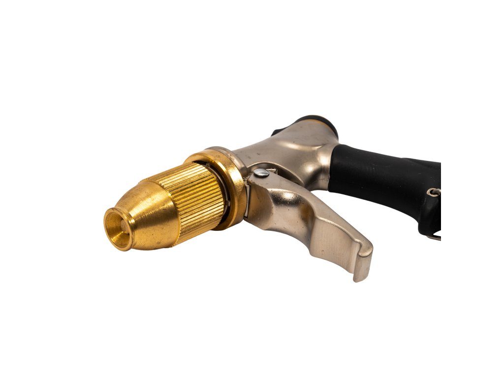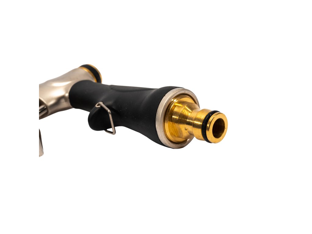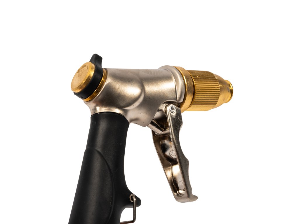 Hadicový postřikovač s pogumovanými prvky proti prokluzu. možnost regulace průtoku vody a aretace spouště.Doplňkové parametry